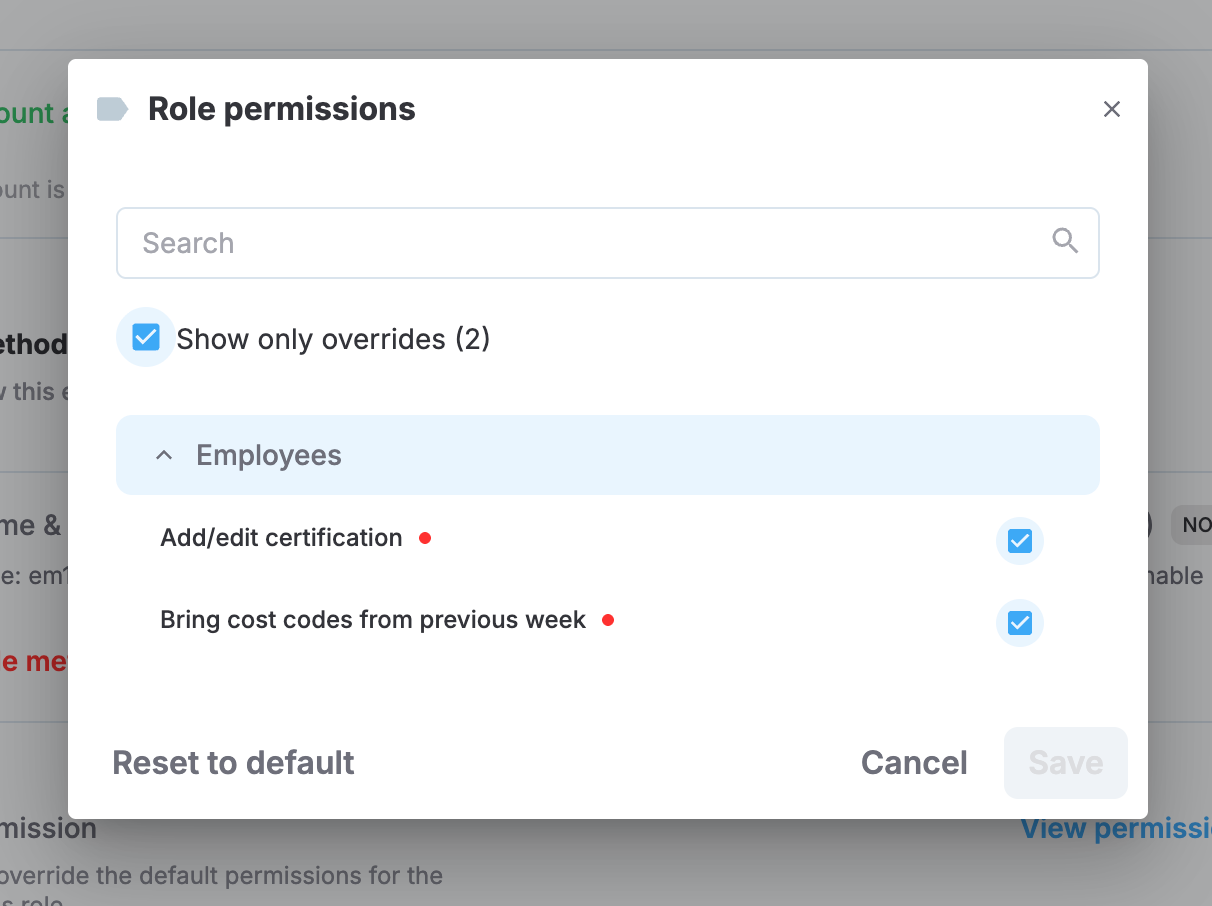 The Role permissions dialog in the employee profile has been updated to make it easier to identify and manage permissions that have been overridden from the role's defaults.