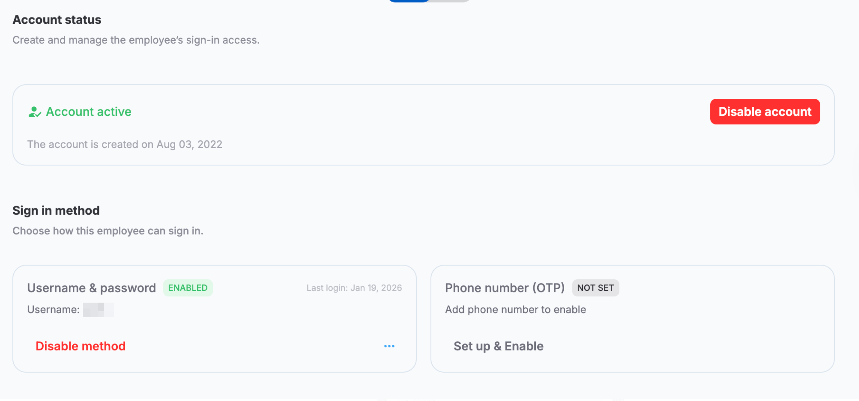 - Phone number sign-in method. Administrators can enable phone number sign-in for any employee user account from the Account & Access tab in the employee profile. Instead of a password, the employee receives a temporary numeric code via SMS each time they sign in. Both sign-in methods can be active simultaneously for the same account and managed independently.