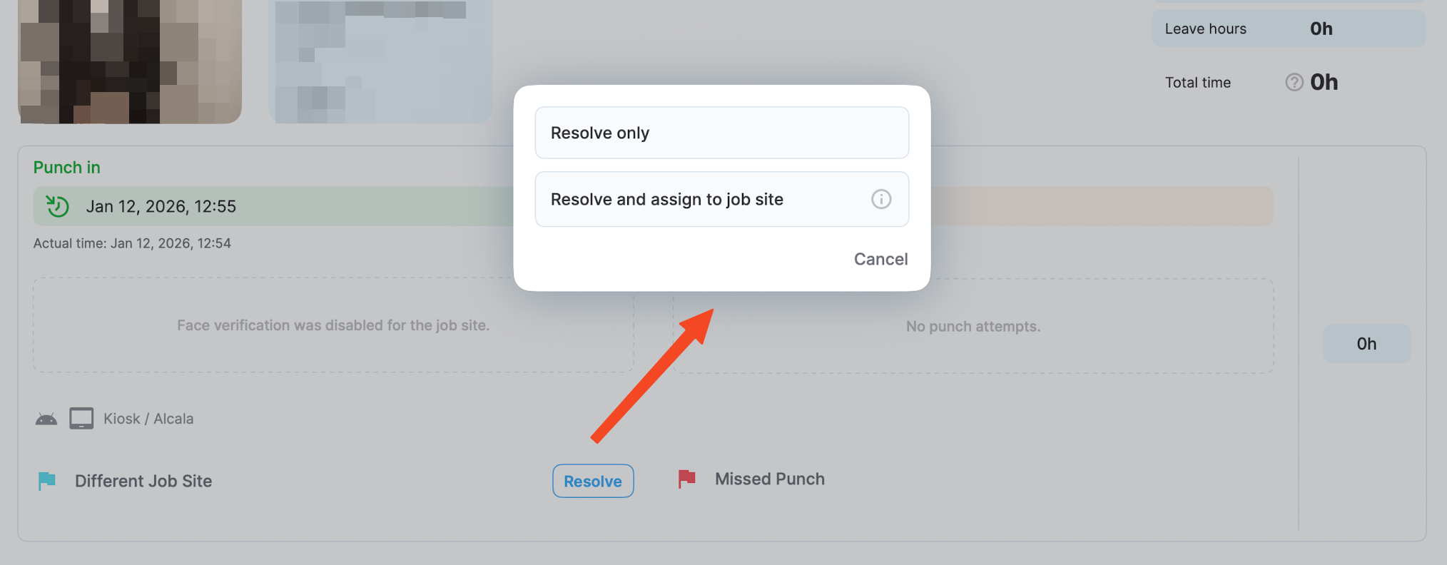 - Resolve and assign to job site: Resolves the flag and assigns the employee to the job site where they had punched. This action applies only to this particular timelog, and other Different Job Site flags must be handled separately.