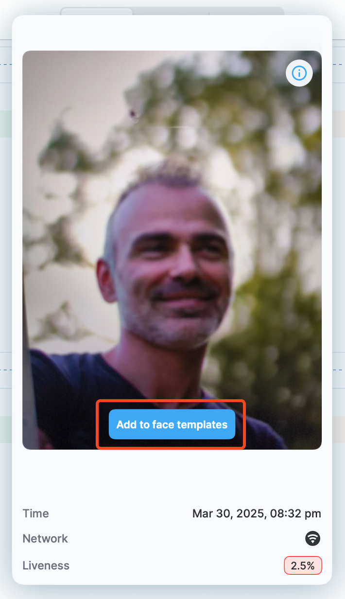 Select the punch photo to expand it and access the Add to face templates option, which adds the photo to the employee's photo library to be used for face recognition later on. From there, the photo can also be added as a profile picture. This can be useful if, for example, the appearance of the employee has changed, and the profile photo needs to be updated to reflect the current appearance.