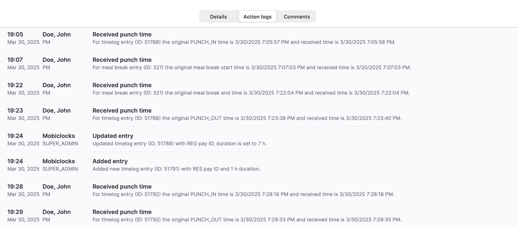 Next to Details, you have the Action logs tab containing detailed logs on all the actions taken on the selected timelog entry. The following screenshot shows an example of the logs with information on punch times, manual updates, and so on.