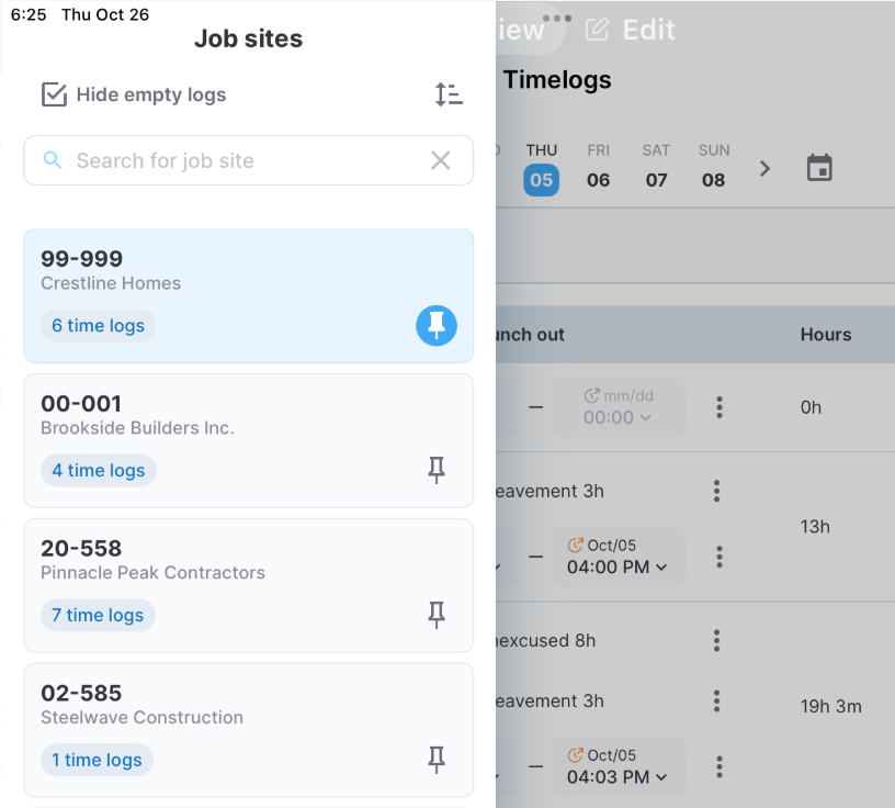 Each item in the navbar contains the job site name, number, and the number of timelogs with entries. Apart from letting you select a job site to view corresponding timelogs, the navbar has some additional functionality:
