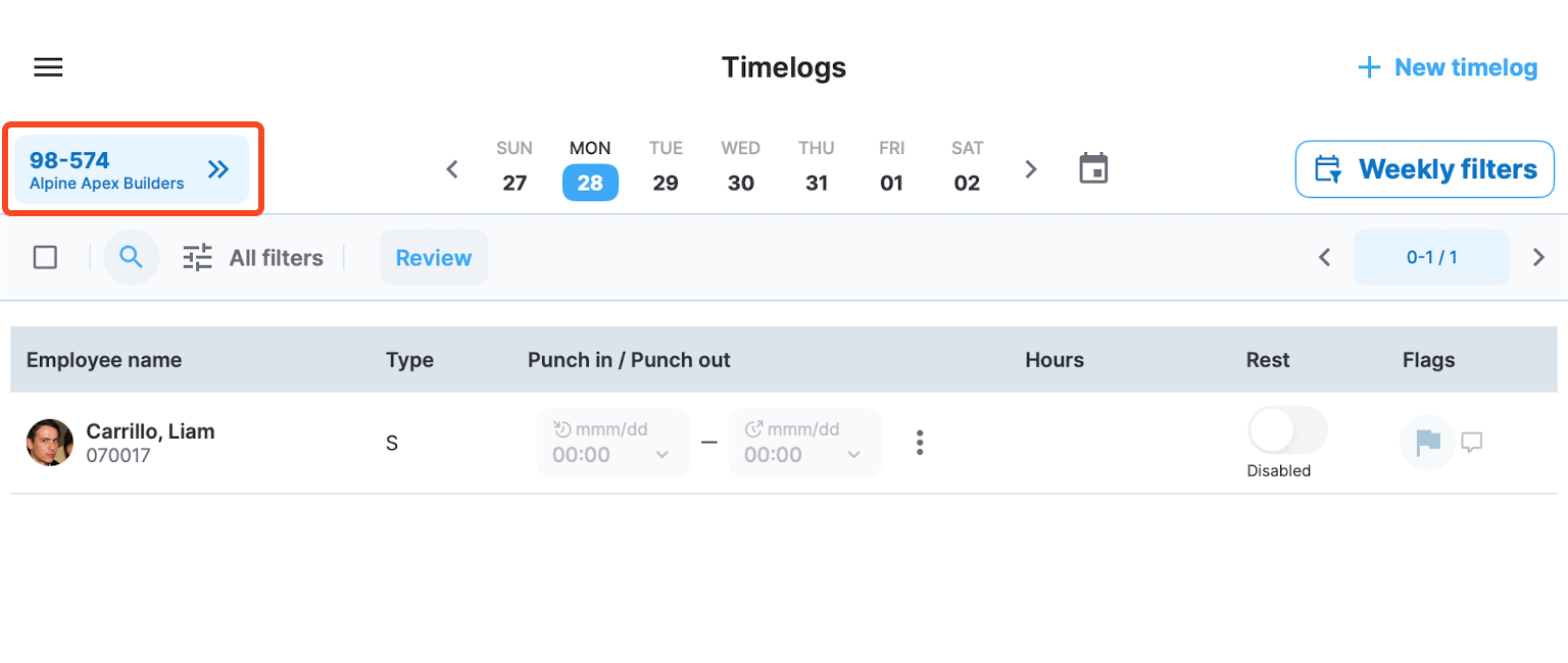 The timelogs table is where you see a list of timelogs filtered by job site, date, and other parameters.