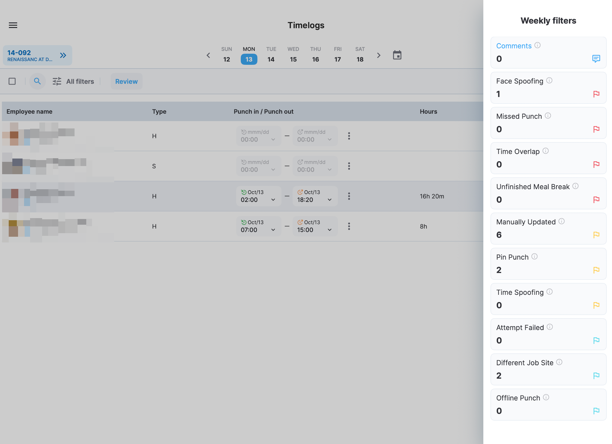 At the top of the screen, you have Weekly filters, which lets you filter flagged timelogs by different flag types. For more information on flag types and when they are applied, see Manage flag settings. For an overview of flags in Admin App, see Flags.