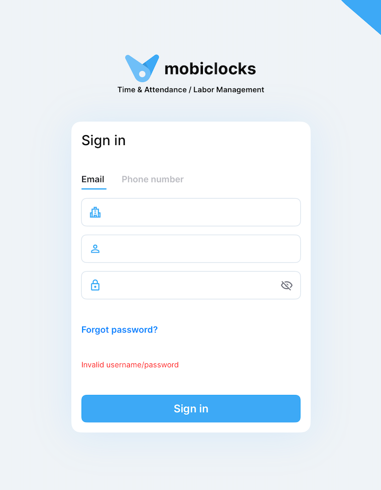 To access the MobiClocks Admin App, open Admin App on your device. The following two sections describe the sign-in process for back-end user and employees. Proceed to the section relevant for you.