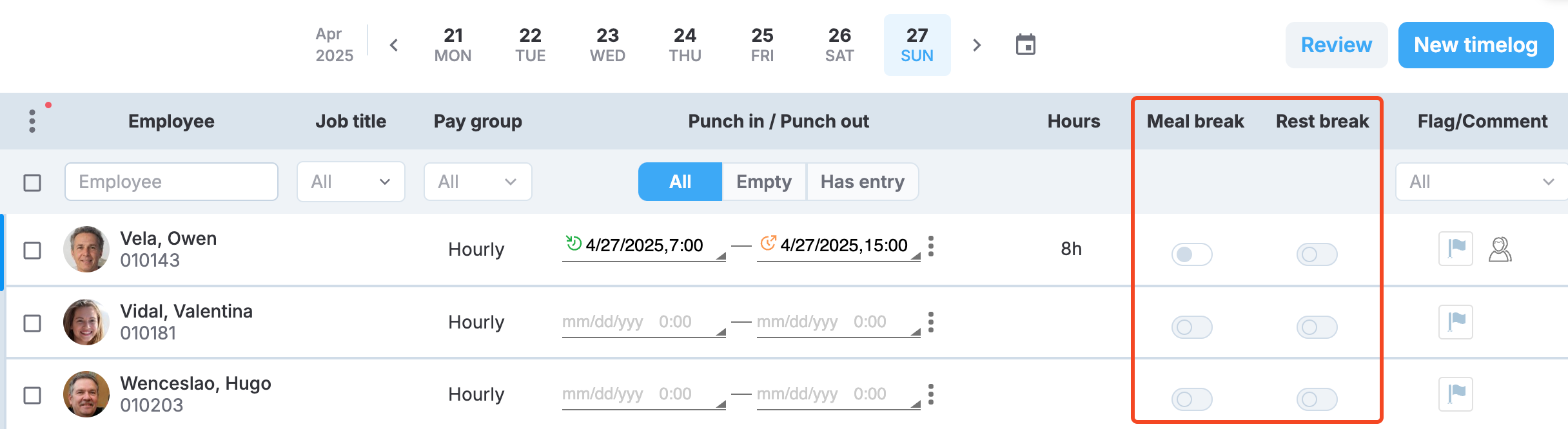 Rest break | All the timelogs are by hourly employees and contain at least one entry. |