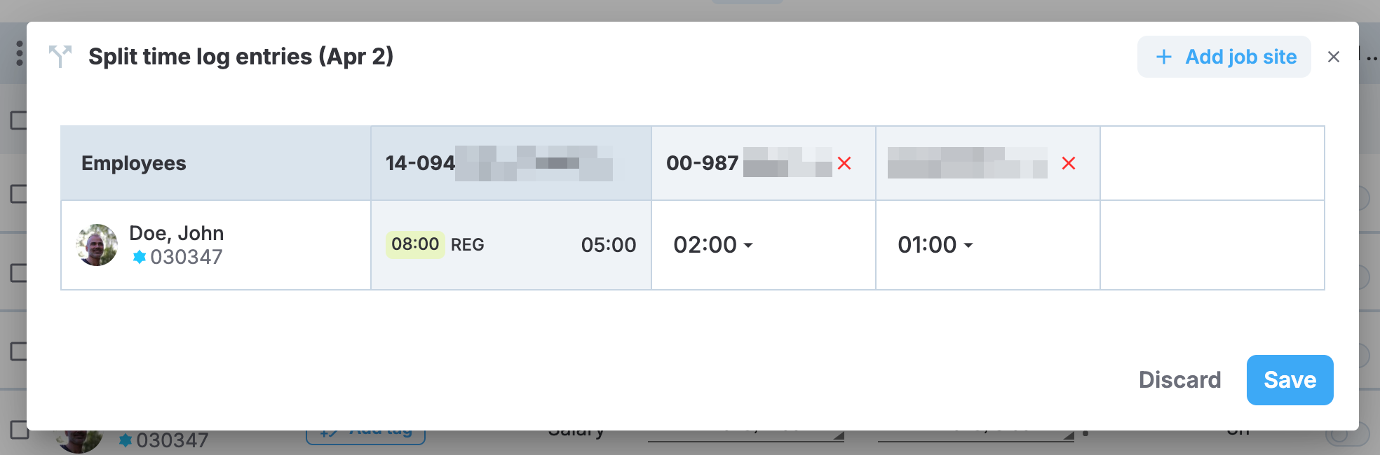 - The total hours across all job sites must equal the original timelog entry duration.