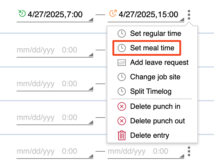If Trackable meal policy is enabled for the job site, you have the Set meal time action to manually set one or multiple meal breaks. The timelog must already contain a punch entry for the option to become available. The following screenshot highlights the Set meal time action in the list of timelog actions.