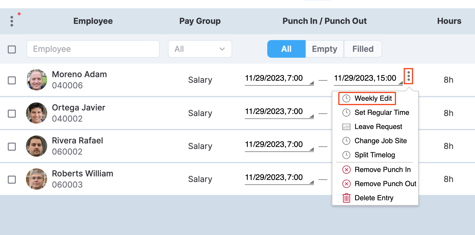 Using this action, you can remove a punch in that has already been registered. The action is not available for leave request entries and if the punch time of the entry is missing.