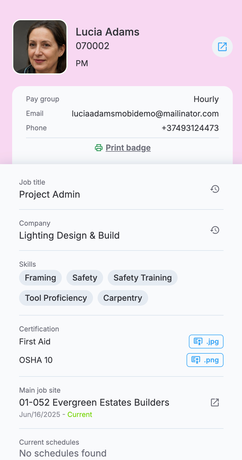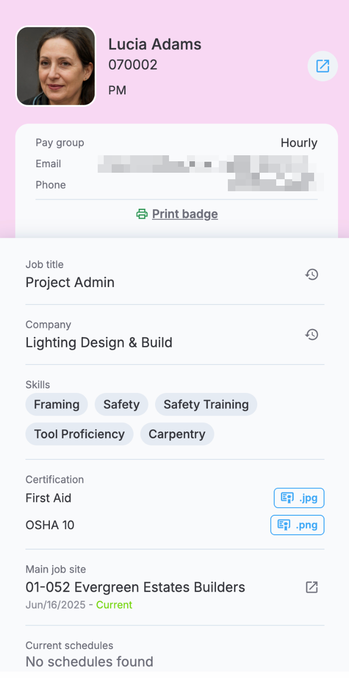 Note that the printable version of the badge is more concise and includes only a few key employee details.