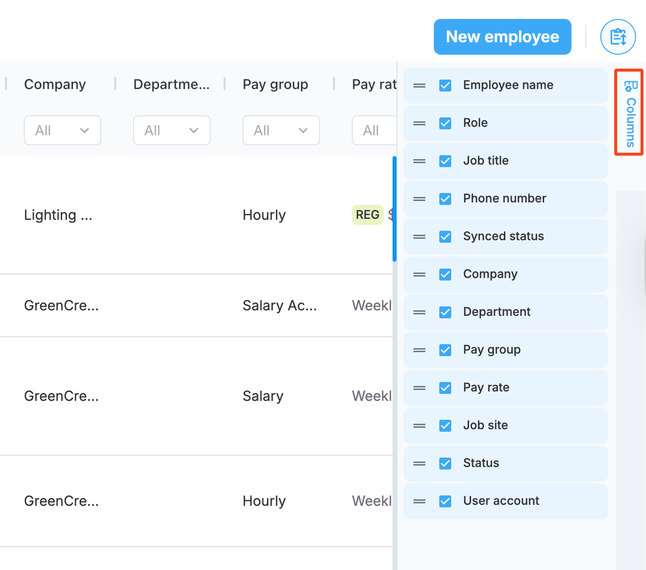 Each of the fields mentioned above has search or filtering options that you can use to locate employee profiles based on your chosen criteria. Additionally, the Columns menu in the top right corner lets you choose which columns to display. Some columns are mandatory, while others are optional. The folllowing screenshot shows the column visibility menu.