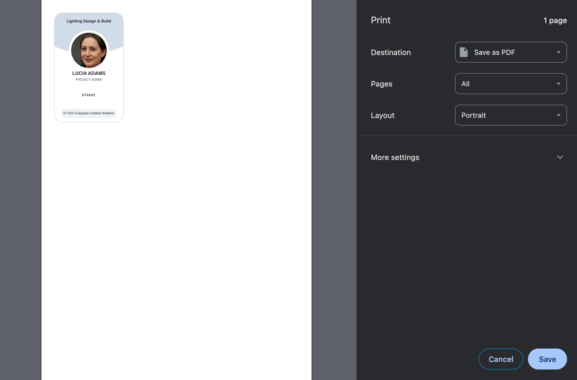 Select Print badge to print the employee badge. This action opens the print dialog in your browser, where you can print it using any of your configured printers. The following screenshot shows the print dialog open in Chrome and set to save the badge as a PDF.