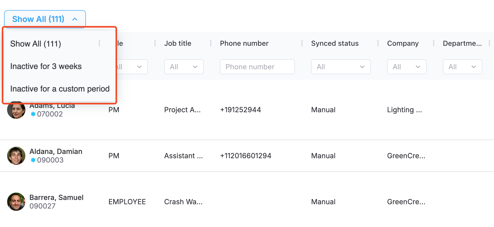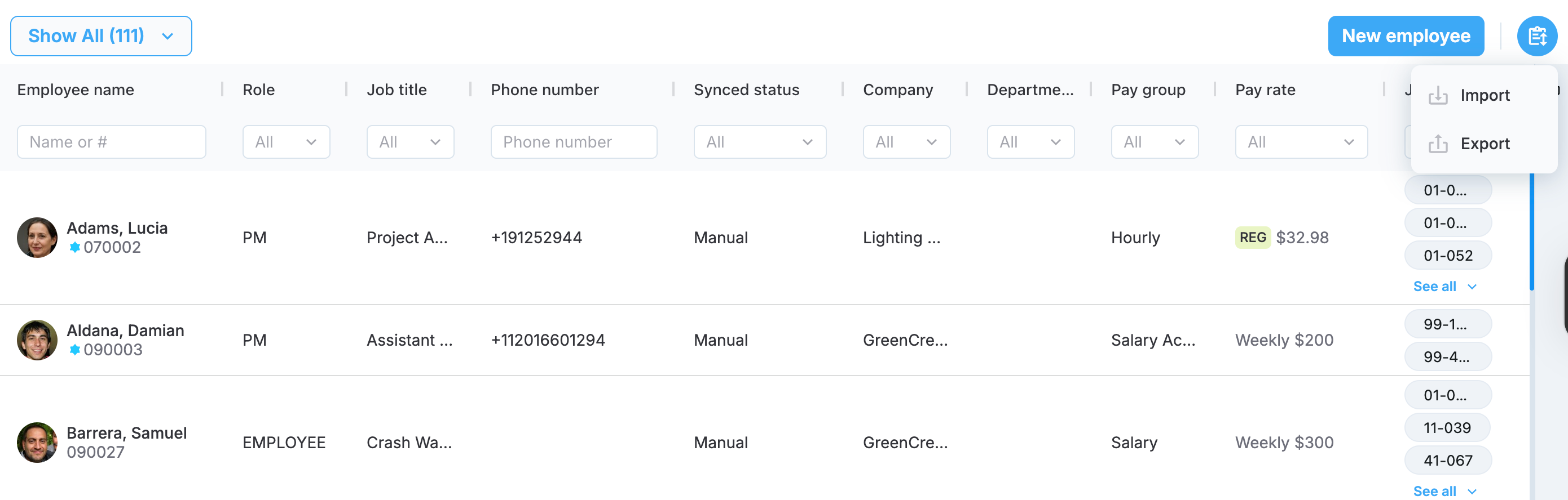 - Synced status. Indicates if the employee has been created manually or imported from a third-party integration, showing the name of the integration.