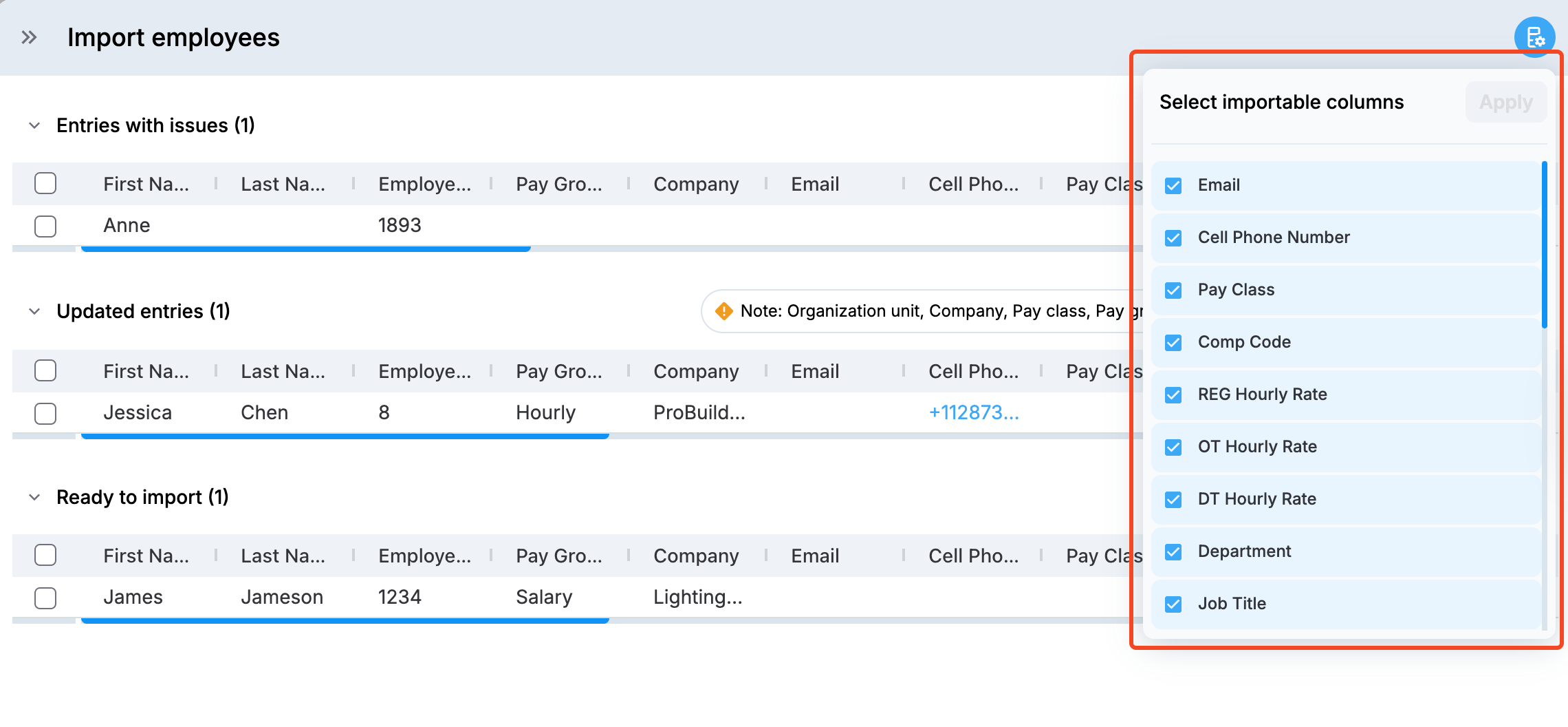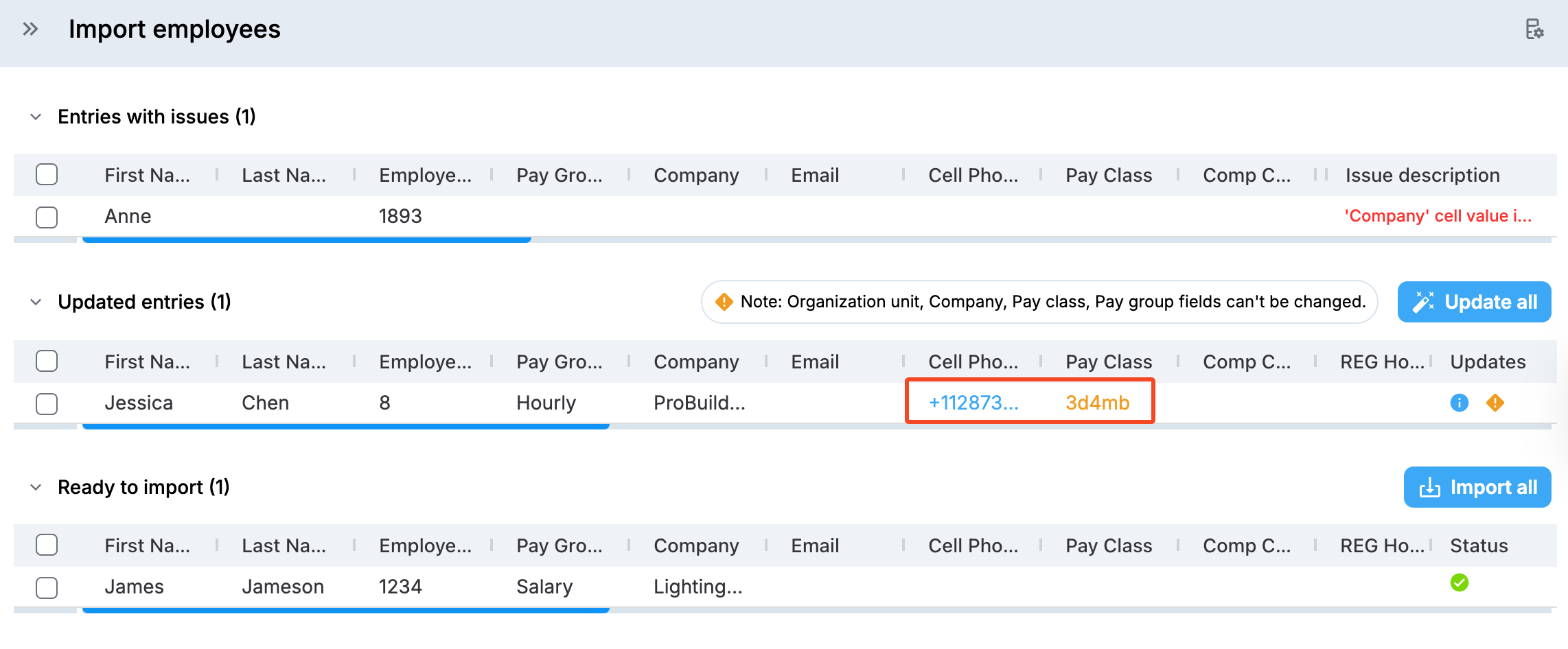 Ready to import: This section includes all the entries that are ready to import and can be added to your list of employees immediately by selecting Import all.