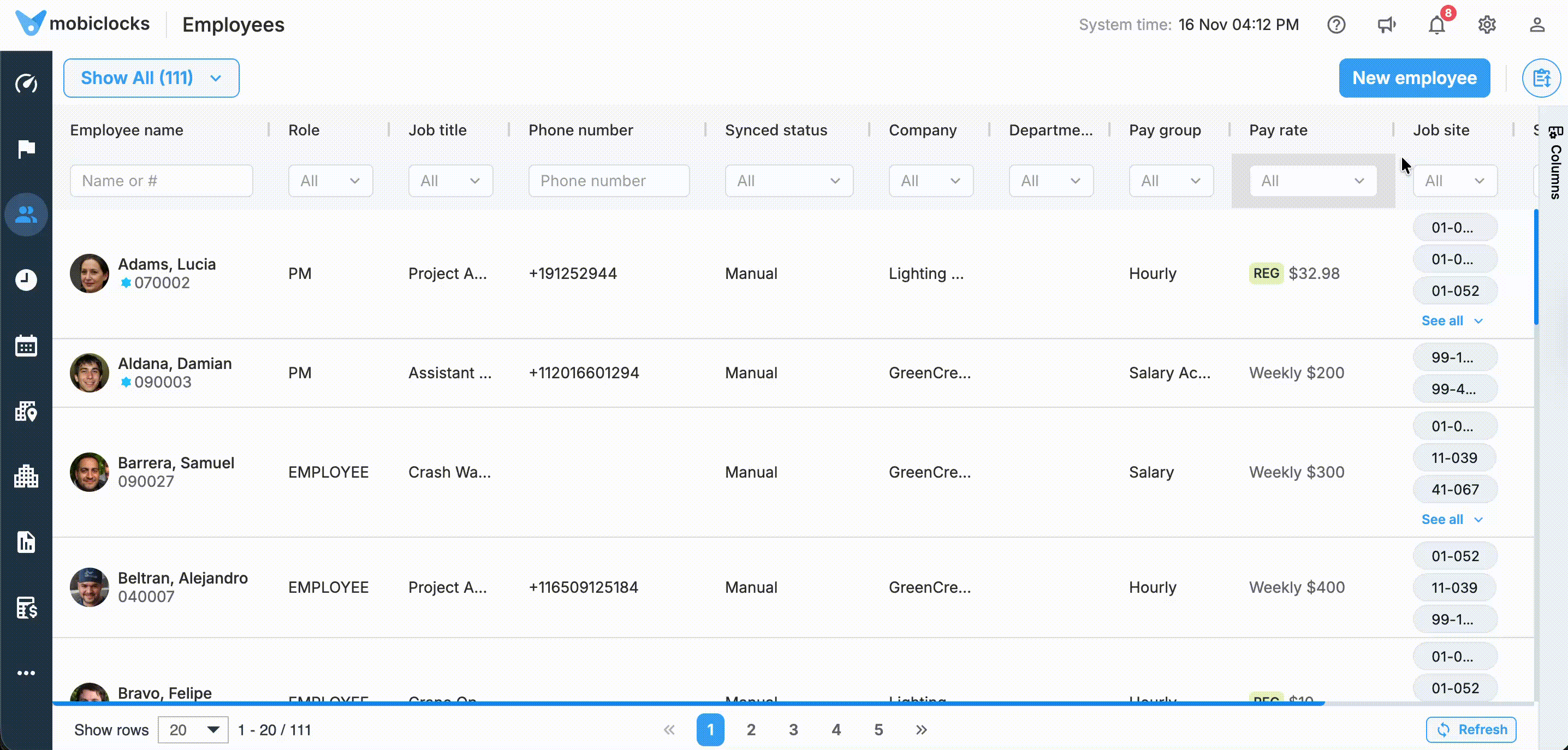 The integrations that support employee sync have a separate Employees tab where the list of employees is available. The following screenshot shows an example of the Employees tab of an HCSS integration.
