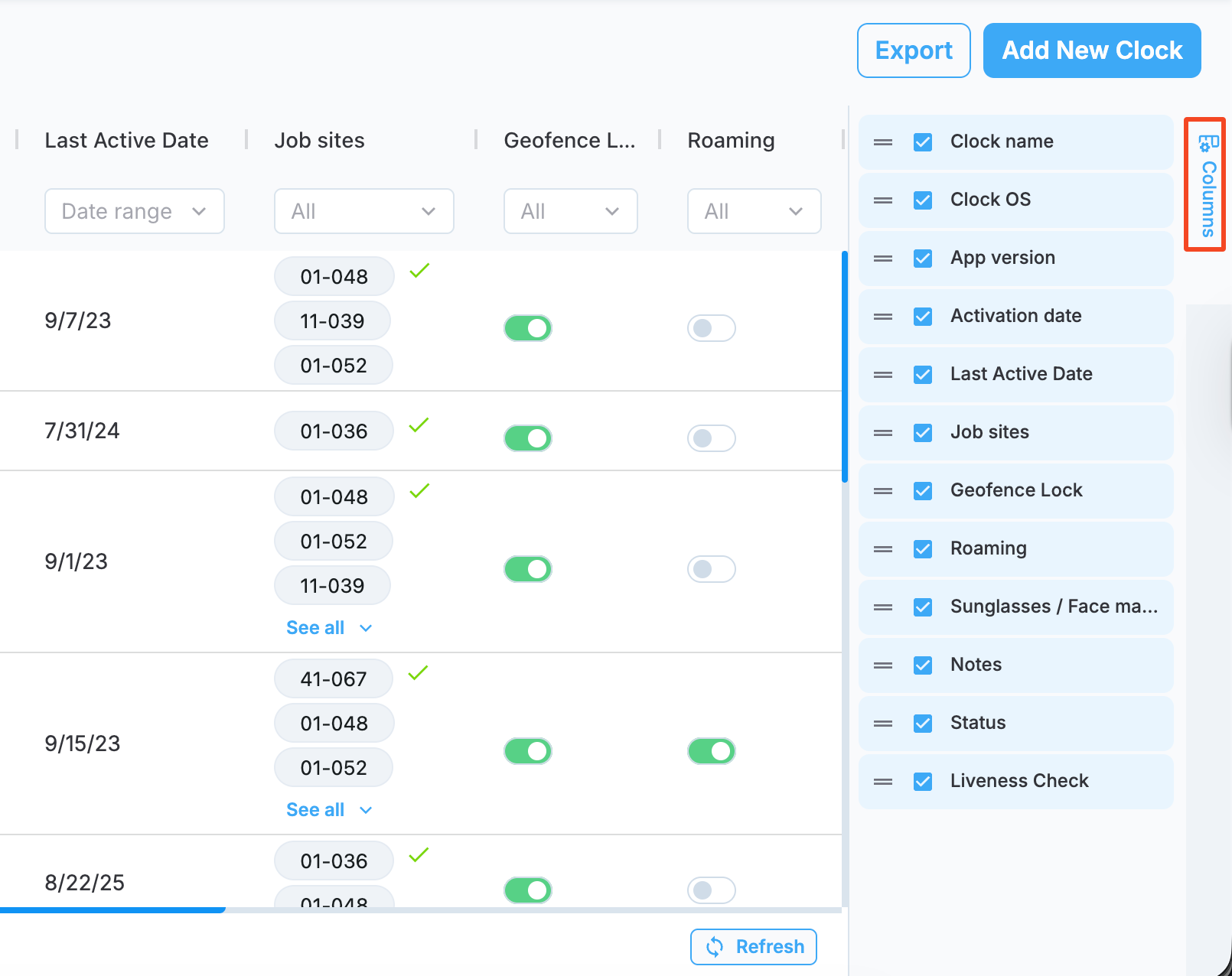 You have the option of exporting the complete list of clocks along with their details as an XLSX file.