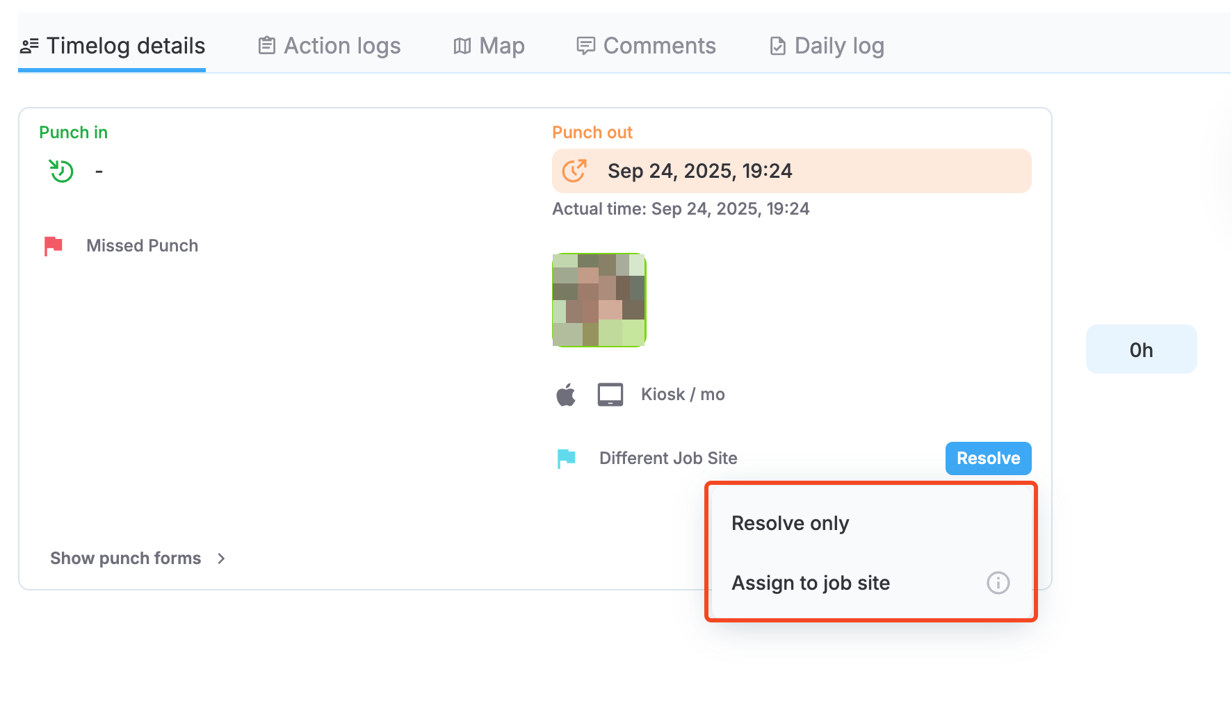- Assign to job site: Resolves the flag and assigns the employee to the job site where they had punched. This action applies only to this particular timelog, and other Different Job Site flags must be handled separately.