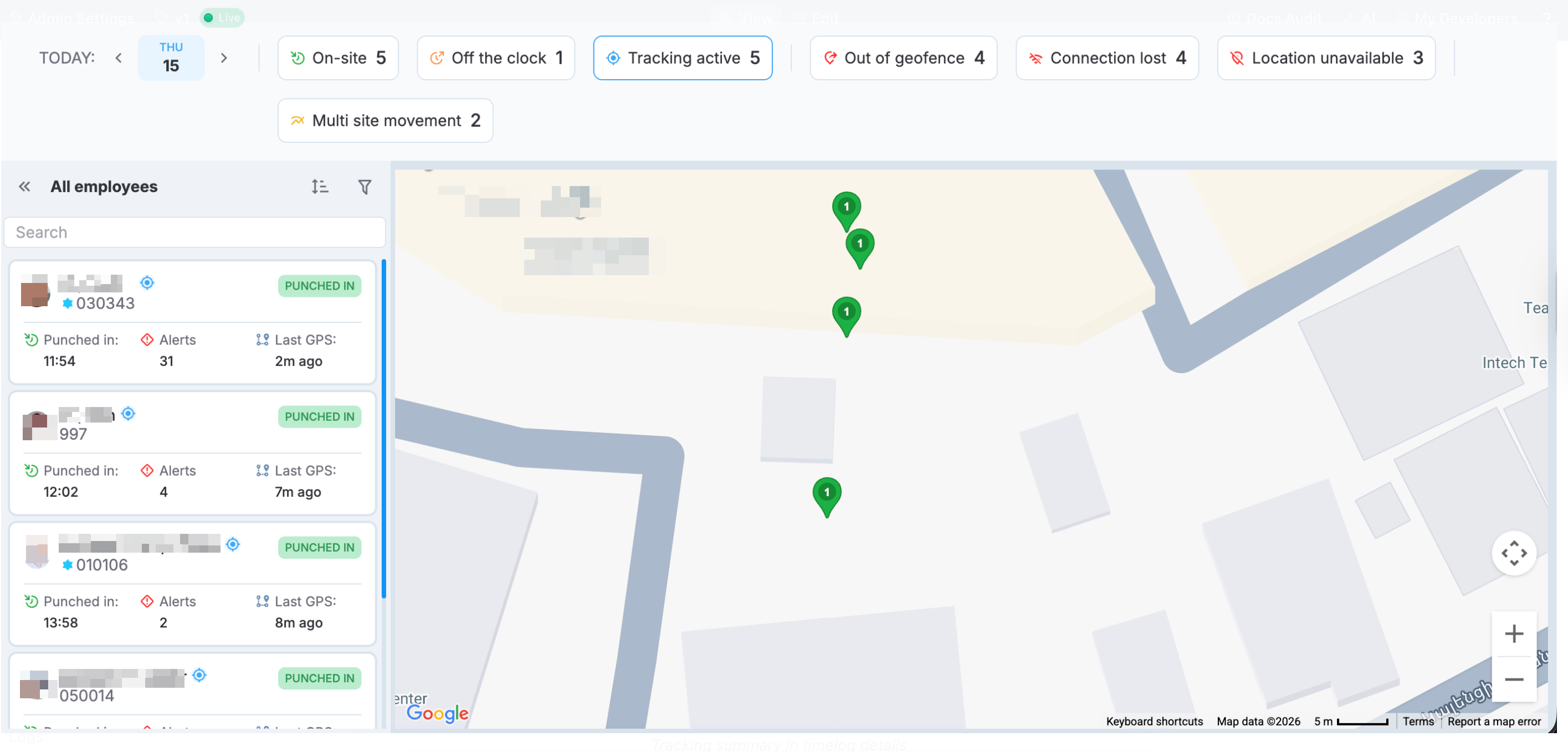 Tracking active: Shows the number of employees for whom GPS tracking is active and collecting location data. Location tracking is active only when employees are punched in through Personal App.