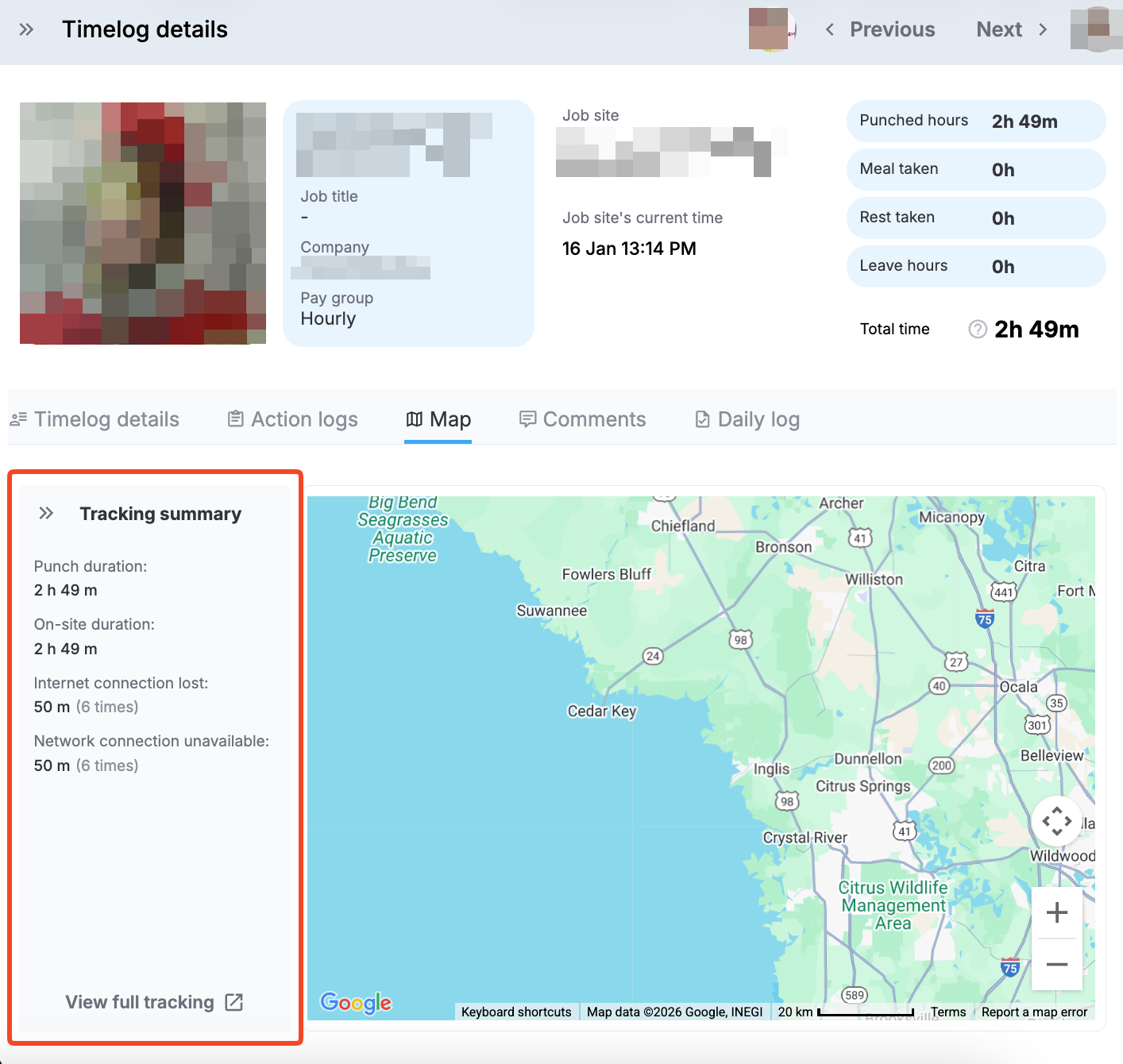 Apart from tracking employee activities in the Tracking page, you have Tracking summary in the timelog details page. The summary includes some key facts about the employee activity for the selected day and has a View full tracking action to navigate to Tracking to see more details.