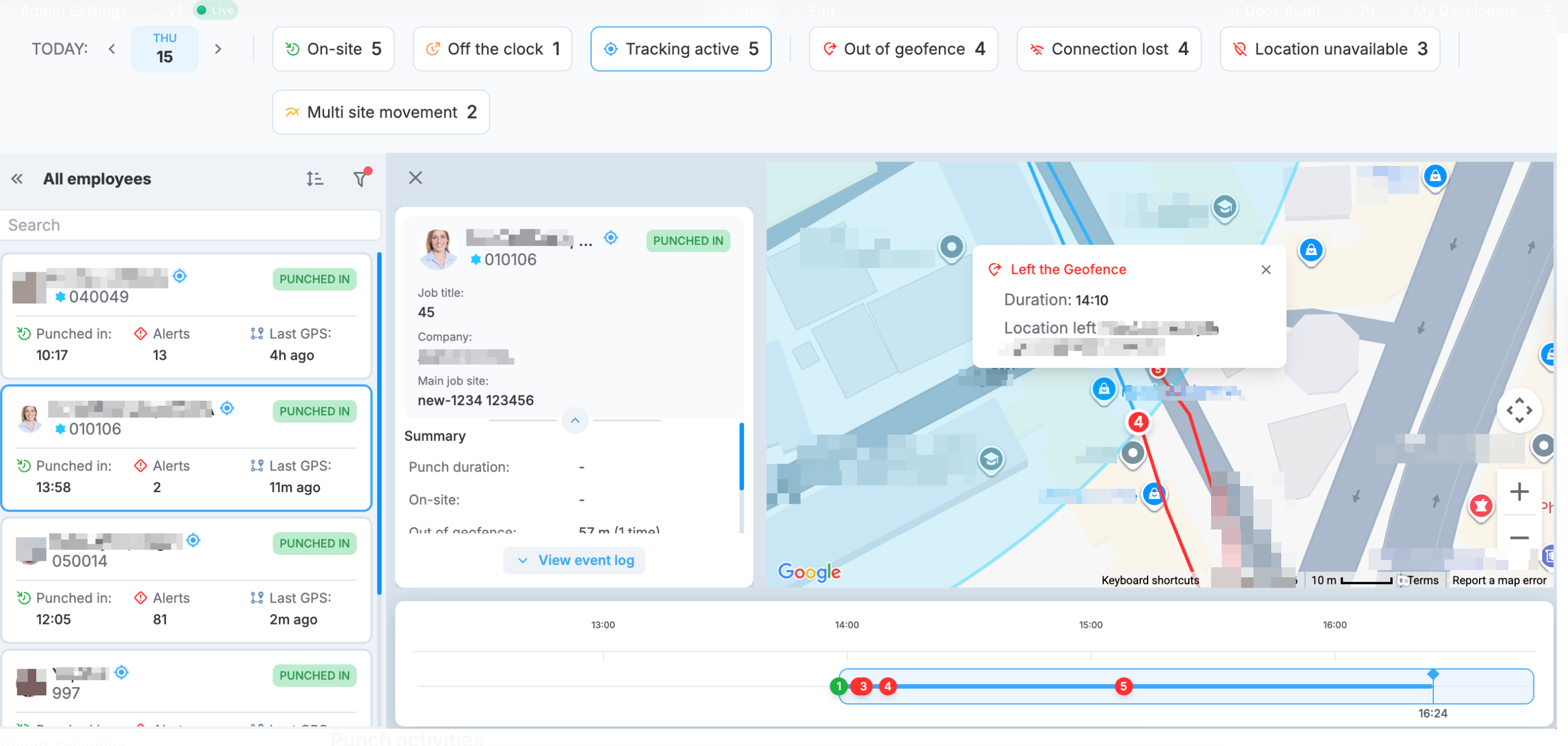 The timeline provides a quick visual overview of the employee's movement patterns, making it easy to identify when alerts occurred and how long tracking conditions persisted.