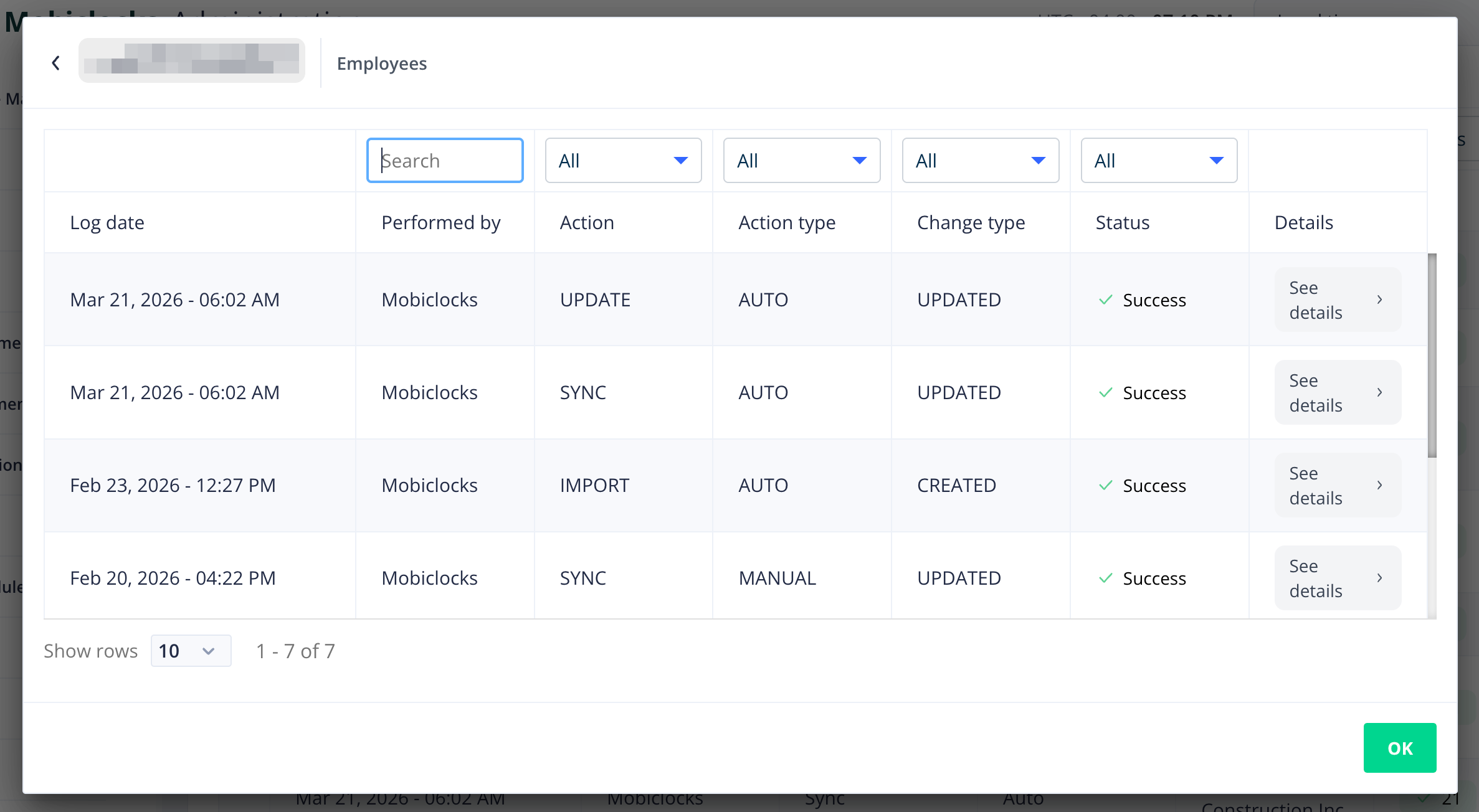 This section includes details on each employee sync, import, or update action. The logs table consists of the following fields:
