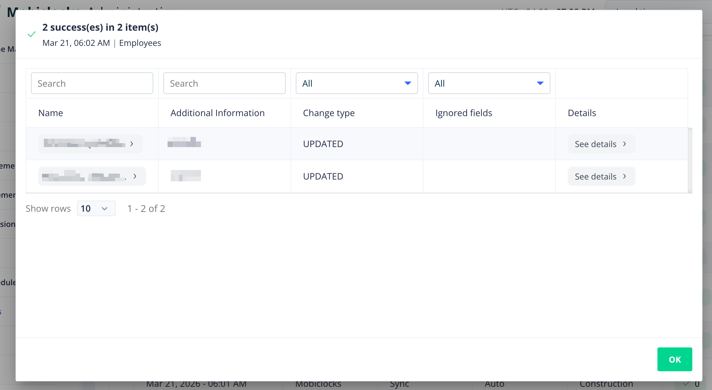 The Success status is shown in case the action has been completed successfully. Select the status to see the full list of employees affected. The following screenshot shows the dialog with the full list of employees.